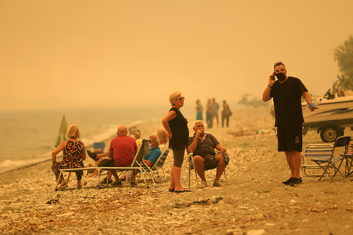 当地时间2021年8月8日,当地居民在希腊埃维亚岛的海边休息。欧盟委员会当地时间8月9日表示,在接到希腊、北马其顿、阿尔巴尼亚、意大利以及土耳其等国的请求后,欧盟现已协助调派14架飞机以及约1300名消防员支援灭火。