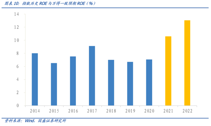 从ROE来说,2014年-2020年ROE都比较稳定,从一致预期来看,2021年和2022年的ROE均将达到10%以上,相比之前的7年大幅提升,可以预期指数业绩未来将保持较高的增长率。