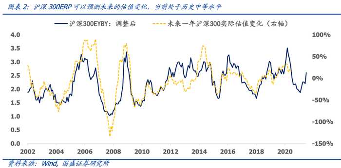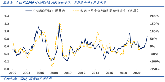 ②估值层面中证500有巨大的优势。对于指数长期的估值变化率,海外机构大多喜欢假设未来指数估值将会回到过去10年的估值中枢水平。不过根据我们的实证来看,这种方法的效果并不好。我们从FED模型出发,即假设市盈率倒数EY与其匹配的债券收益率BY的比率为中枢稳定的序列,用当前时点的EY/BY与未来一年指数估值变化率进行回归,从而估算指数的估值变化率。从下图的历史结果来看,ERP是预测未来一年估值变化的优秀变量。