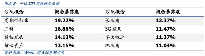从指数涉及概念来看,中证500指数无特别主导的概念,在多个概念上均有涉及。概念暴露度在10%以上的包括周期性行业、三新、科技龙头、核心资产、长三角、5G应用、华为概念和珠三角。相比之下中证500在周期性行业上的暴露度较高,受到一定的经济周期波动影响。在科技龙头、5G应用概念上的暴露度也为中证500提供了一定的成长性。