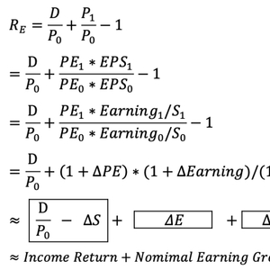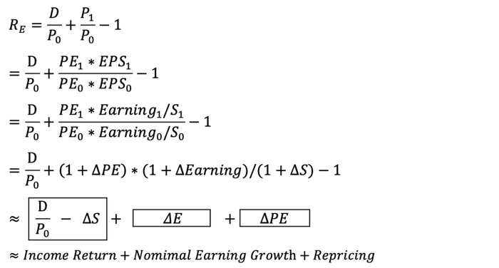 Grinold和Kroner(2002)提出单期股权收益供给模型:即股权收益拆解成四个部分,分别是股息率、股本稀释率、名义利润增速和估值变化率。当然由于股息率和股本稀释率数量级较小且每年波动的幅度有限,真正影响股票未来一年预期收益的主要是盈利增速项和估值变动项。模型公式推导如下:
