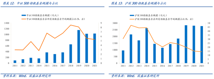 中证500指数基金规模位列第二,十年来快速增长。中证500指数基金规模在近十年间扩张迅速并在近三年保持稳定,在全市场指数基金中规模排名第二,仅次于沪深300指数基金,且与其占比差距逐渐缩小。截至2021年8月5日,中证500指数基金规模占比5.3%,较2011年提升2.3个百分点,绝对规模水平提升1013.6%,相比之下,沪深300指数基金的占比下降16.4个百分点,规模提升190.8%。