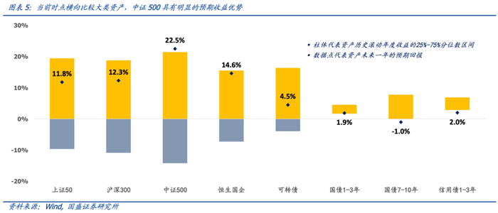横向比较各大类资产,中证500是目前我们跟踪的所有资产里面预期收益最高的,因此无论从股债大类资产绝对收益的视角来看,还是从权益内部相对收益的视角来看,中证500指数均为更好的配置工具。