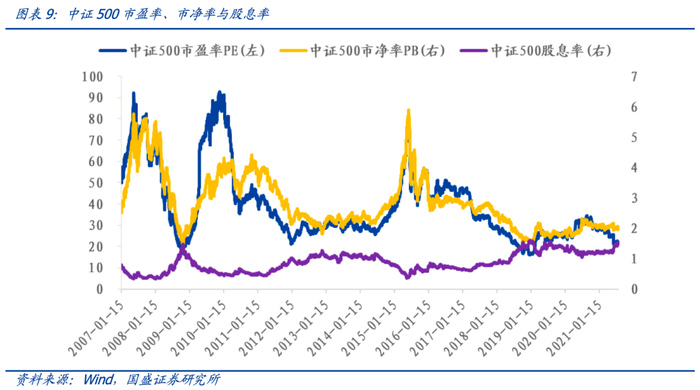 中证500当前总体估值水平较低且股息率水平非常高。中证500当前市盈率为21.9x,处于历史6.46%分位数水平,当前市净率为2.0x,处于历史17.95%分位数水平,股息率为1.47%,处于历史97.91%分位数水平。
