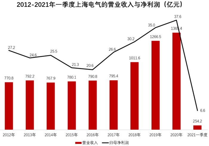 而这已经超出上海电气近2年的归母净利润总和,财务数据显示,上海电气2019年、2020年的归母净利润分别为35亿元、37.6亿元,2021年一季度的归母净利润为6.61亿元。