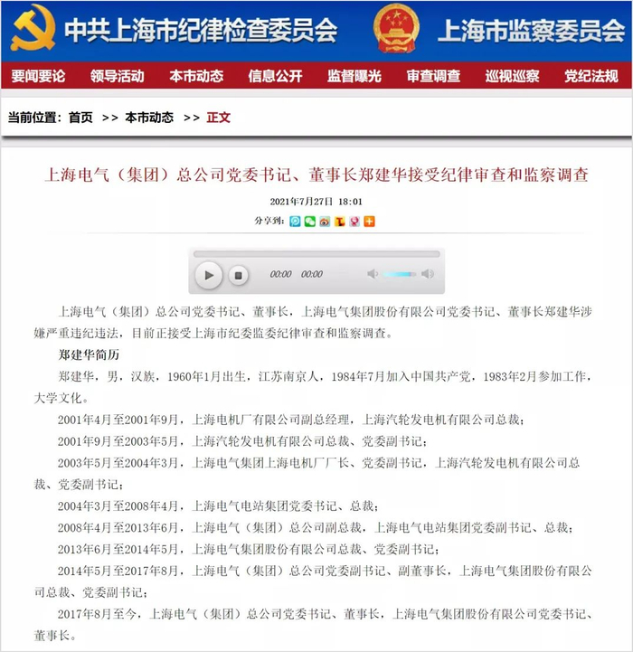 值得注意的是,就在9天前(7月27日),上海电气的董事长郑建华“出事”了。根据中共上海市纪律检查委员会、上海市监察委员会网站消息,上海电气(集团)总公司党委书记、董事长,上海电气集团股份有限公司党委书记、董事长郑建华涉嫌严重违纪违法,目前正接受上海市纪委监委纪律审查和监察调查。