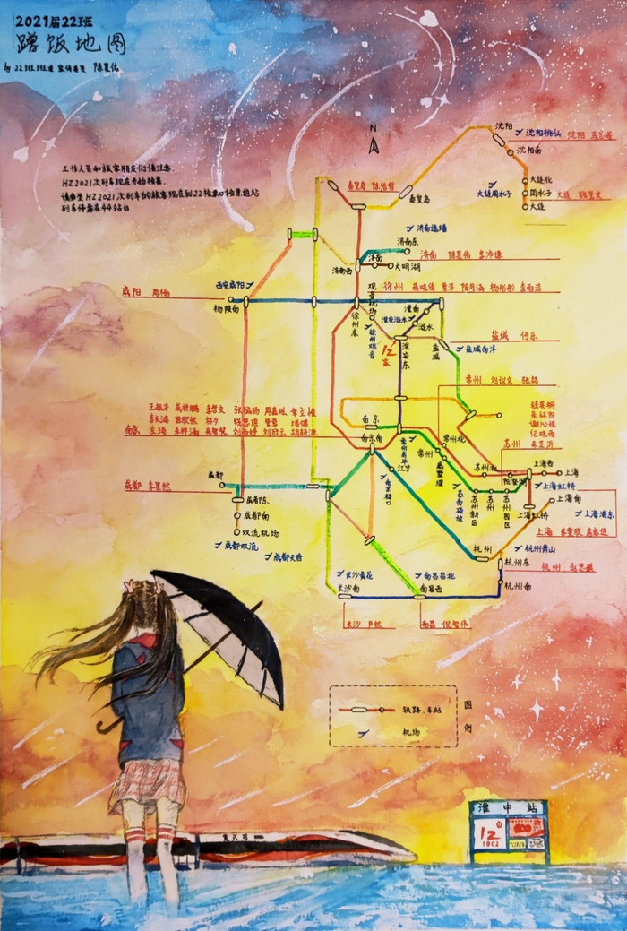 江苏省淮阴中学22班的班级“蹭饭地图”,背景是一名女孩撑着伞走在雨中的暖色调画。“蹭饭地图”的设计者小陈同学擅长绘画,制图过程中加入了自己的想法和创意:图中只重点保留同学将去就读的城市的机场、火车站名称与乘坐交通工具的路线,并标注将在这些城市读大学的同学的名字。这样,“蹭饭”路线变得清晰明了。