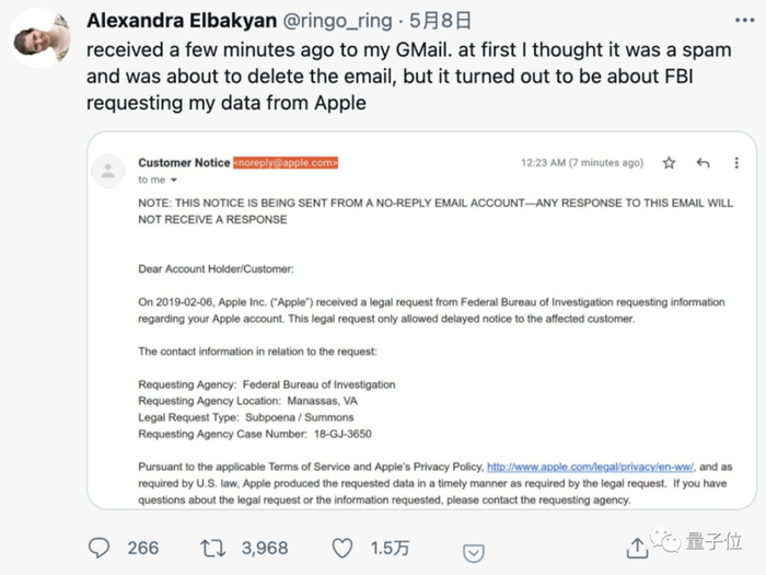 到了5月,Alexandra老姐更是收到了来自苹果公司的一封邮件,告知2年前她的账户数据已经交给了FBI。