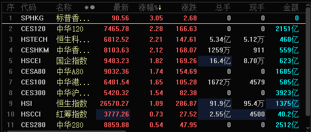从港股行情来看,亦出现全面走强的势头。恒生科技指数涨幅超2%,恒指亦反弹超1%。恒指成份股海底捞、美团和腾讯控股等中资蓝筹股集体飙升,恒大系个股亦全面走强。