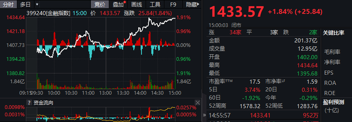 此外,金融股亦集体反弹,金融指数大涨近2%,券商股全线飘红,绝大多数银行股和保险股亦以红盘收报。
