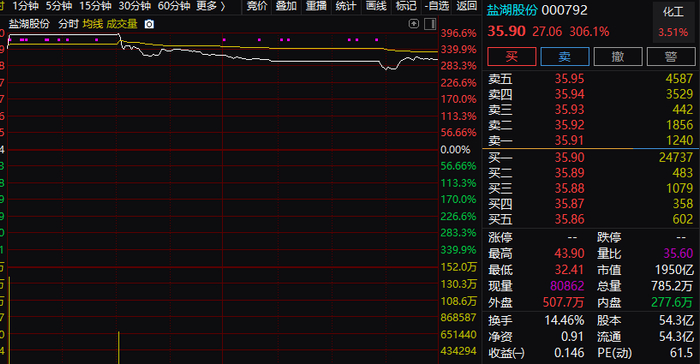 那么,究竟发生了什么导致了这种风格的变化?从市场内部来看,主要是盐湖股份回归,给相关板块的估值带来了一定的困扰。盐湖股份今天一度冲高至43.9元的高位,锂电相关股票也一度冲高,但随后该股持续回落,收盘仅报35.9元。这种走势严重冲击到了盐湖提锂板块个股的表现,整个板块除盐湖股份外,集体杀跌,多股出现跌停的情况。