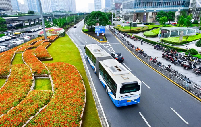 以白色为主色调的电动智能公交车,俗称“白金刚”↓