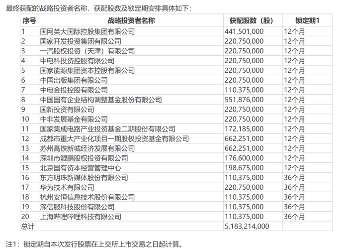 8月10日,中国电信披露战略配售结果,共20家战略投资者,配售数量为51.83亿股,约占绿鞋行使前本次发行总量的49.86%,约占绿鞋全额行使后本次发行总量的43.35%。20家战略投资者包括:国家集成电路产业投资基金二期、中国国有企业结构调整基金、华为技术有限公司、上海哔哩哔哩科技有限公司、安恒信息、东方明珠、深信服等。其中,华为获配2.2亿股,大基金二期获配1.72亿股。