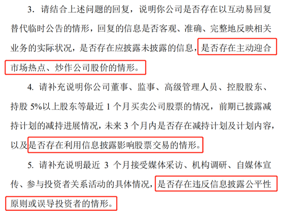 同时,深交所还质疑南京聚隆是否存在“蹭热点”的行为,关注函中深交所质疑,“公司是否存在以互动易回复替代临时公告的情形,回复的信息是否客观、准确、完整地反映相关业务的实际状况,是否存在应披露未披露的信息,是否存在主动迎合市场热点、炒作公司股价的情形”,“是否存在利用信息披露影响股票交易的情形”,以及“是否存在违反信息披露公平性原则或误导投资者的情形”。