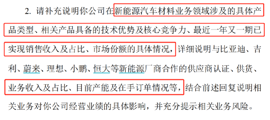 针对公司“已获得比亚迪、吉利、蔚来、理想、小鹏、恒大等新能源汽车厂商等国内外知名新势力新能源汽车厂商的供应商认证并供货”的说法,深交所要求南京聚隆说明公司在新能源汽车材料业务领域涉及的具体产品类型、相关产品具备的技术优势及核心竞争力、最近一年又一期已实现销售收入及占比、市场份额的具体情况,并详细说明与比亚迪、吉利、蔚来、理想、小鹏、恒大等新能源厂商合作的供应商认证、供货、业务收入及占比、目前产能及在手订单情况等。