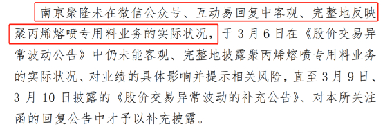到了2020年7月24日,南京聚隆公告收到《关于对南京聚隆科技股份有限公司及相关当事人给予通报批评处分的决定》,因未能客观完整进行信息披露,南京聚隆及相关当事人被通报批评。同日,南京聚隆收到江苏证监局下发的警示函,指出南京聚隆“在此次股价异动公告中未披露聚丙烯熔喷专用料对主营业务收入占比较小的情况,也未说明是否会对公司业绩产生重大影响,信息披露不完整。”