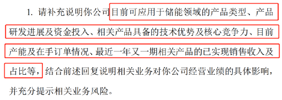 在关注函中,深交所要求南京聚隆说明公司储能业务的具体情况,包括目前可应用于储能领域的产品类型、产品研发进展及资金投入、相关产品具备的技术优势及核心竞争力、目前产能及在手订单情况、最近一年又一期相关产品的已实现销售收入及占比等。