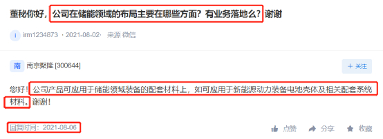 记者查询了此前南京聚隆包括年报在内的各种公告、以及深交所互动平台,均未发现南京聚隆曾经在公开渠道披露公司在储能领域的布局。而这一点显然也引起投资者关注,8月2日,有投资者在互动平台上进一步提出疑问,“公司在储能领域的布局主要在哪些方面?有业务落地么?”8月6日,公司做出回复,表示“公司产品可应用于储能领域装备的配套材料上,如可应用于新能源动力装备电池壳体及相关配套系统材料。”