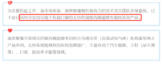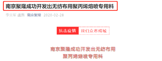 2020年2月28日,南京聚隆在微信公众号平台发布文章,标题为“南京聚隆成功开发出无纺布用聚丙烯熔喷专用料”,当时正值新冠疫情期间,文章称“为支援抗疫工作,急市场所急,南京聚隆组织强有力的技术攻关团队连续奋战,已于近日成功开发出可用于医用口罩的无纺布用聚丙烯熔喷专用料系列产品。”并表示,“南京聚隆开发成功的聚丙烯熔喷专用料分为通用型(高流动低气味)和抗菌型两大产品系列。无纺布用熔喷料的应用范围很广,主要应用于汽车吸棉、卫材(尿不湿等)、口罩、医用手术服等领域。”