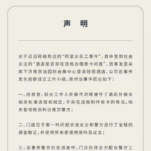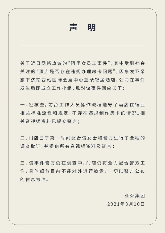 8月10日晚,亚朵集团发布声明称,事发亚朵旗下济南西站国际会展中心亚朵轻居酒店,公司在事发后即成立工作小组。
