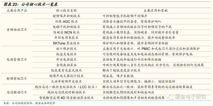 音频功放芯片:在音频功放产品领域,公司引领了国内手机高压模拟音频功放细分领域的技术演进,在2010年率先推出第一代模拟接口K类音频功放产品,该产品突破了手机锂电池电压的限制,使音频功放可以输出更大功率且不破音;公司于2017年推出数字智能K类产品,输出电压、峰值功率、峰值效率等指标表现良好,在国产智能机品牌的旗舰机型上获得广泛应用。并且公司从单一的音频功放硬件芯片发展成为集硬件芯片与软件算法一体的音频解决方案,已得到多家知名品牌厂商认证和使用。