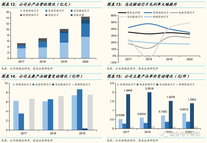 公司在发展过程中不断拓展产品品类,并对现有产品进行迭代,目前已有400余款产品,形成了声(音频功放芯片)、光(LED驱动器)、电(电源管理芯片)、射(射频芯片)、手(马达驱动芯片等触觉相关产品)五条产品线。音频功放芯片和电源管理芯片为公司贡献主要营收,在2020年分别占总营收比为51.9%和31.8%,马达驱动芯片增长较快,占比由2017年的0.04%提升至2020年的8.8%。