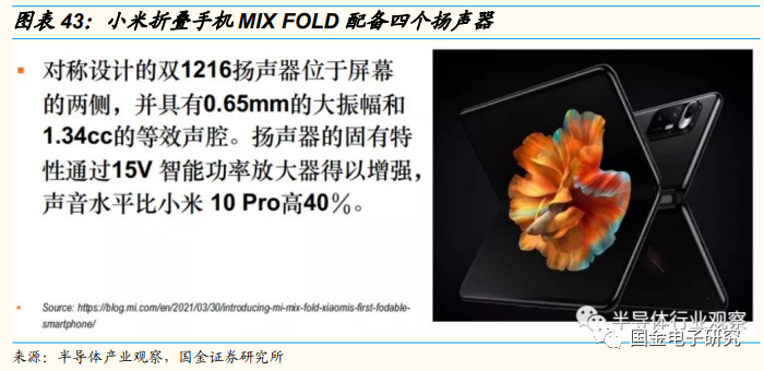 智能手机对于智能升压放大器的需求仍旧巨大。一般情况下,一个手机会有两个扬声器,每个扬声器会配一个放大器。此外,还有一些智能手机为接打电话配备一个专用的扬声器,外放模式也配有一个专用的扬声器。除了这两种常见的情况外,少数智能手机会配有三个扬声器。折叠手机对扬声器又有了新的需求,同时,也带动了智能升压放大器的成长。如小米的折叠手机MIX FOLD就配备了四个扬声器。
