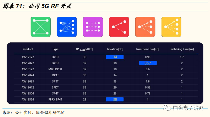 艾为5G开关包括DPDT、DP4T、3P3T、SPDT、SP3T、SP4T六大类型,涵盖了当下所有的主流5G应用。频率全部支持到6GHz,发射开关的功率容限都在38dBm以上。