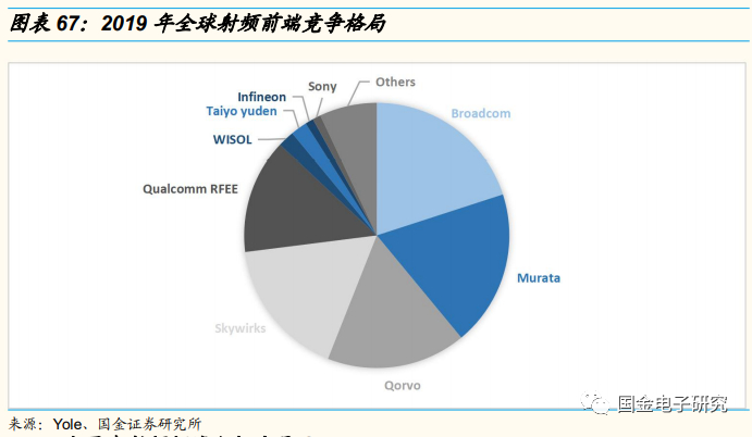 射频前端美日企业占据主导地位,艾为电子大有可为。在射频前端领域,美国及日本企业占据了较高的市场份额,2019年,Broadcom位居第一,全球市占率20%,其次是日本Murata,市占率19%,前五家公司合计占比87%。艾为电子射频前端芯片正在突破,具有较好的国产替代机会。