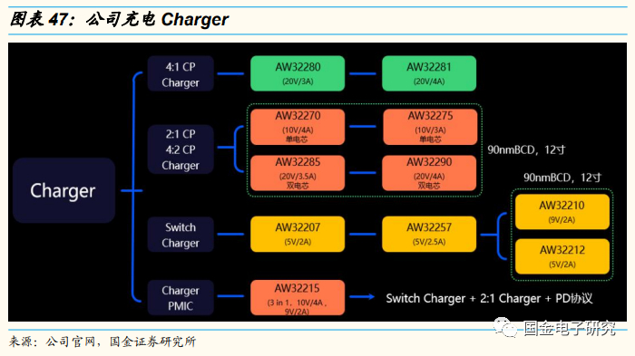 公司针对手机高功率充电进行了一系列的产品布局。而且为了解决产能紧张问题,多款新品直接采用12寸晶圆90nm BCD工艺。