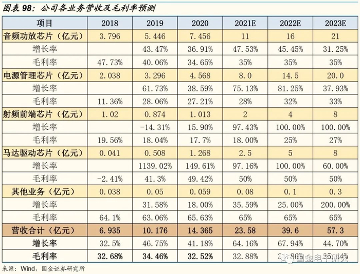 预测音频功放芯片继续保持快速增长。预测音频功放芯片2021-2023年营收11亿、16亿、21亿,同比增长47.5%、45.4%、31.2%。公司模拟音频功放芯片已占据较大市场份额,但是数字功放芯片还有较大的提升空间,随着公司技术的不断提升,相对于凌云、美信、德州仪器等海外竞争对手,公司竞争优势将进一步显现,预测将继续保持快速增长。