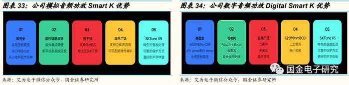 公司模拟功放及数字功放优势。模拟功放Smart K系列具有系列全、软件适配灵活、抗干扰、应用广泛的优势。搭配最新的SKTuneV5算法,可实现更好的声学体验。数字功放Digital Smart K系列具有系列全、低功耗、应用广泛、快速12寸90nm BCD化的特性。搭配最新的SKTuneV5算法,可达到1+1>2的音质效果。