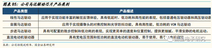公司马达驱动芯片主要用于终端机的触觉反馈操作,应用场景广阔,于2017年首次推出线性马达驱动芯片后不断演进。公司自主研发的马达驱动芯片主要对应智能终端设备上的触觉反馈操作,包含触觉驱动、电容式触摸控制器、步进马达驱动、直流电动机驱动器、音圈马达驱动等芯片产品。线性马达驱动应用于触觉反馈功能,音圈马达驱动应用于摄像头对焦,此外传统马达驱动应用相对广泛。公司于2017年推出国内第一款专门用于线性马达驱动的芯片,通过不断演进发展至今,从高压驱动、常压驱动再到应用算法,实现了产品在听觉和触觉等方面优秀的功能效果。公司创新性地研发了线性马达一致性校准技术,同时实现全模式硬件闭环控制的增强型自动刹车功能,进而推出Smart Haptic Sync 4D算法技术,在算法中突破性地结合使用图像动态检测和用户操作识别等技术,智能识别场景实现逼真的振动效果。