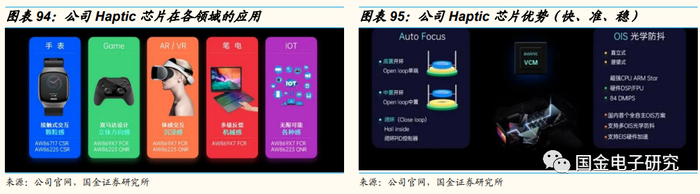 公司发布了基于硬件深度结合的Haptic算法和内容方案——TikTap振效算法。TikTap包括4D游戏振感和Core Haptic两大部分,可为Haptic带来更丰富的内容体验,同时Core Haptic可以提供强大的波形生成引擎,客户和第三方应用可以通过图形化界面设计效果,这对触觉的内容创作提供了很大的空间。公司的Haptic芯片在手机、可穿戴、游戏手柄、虚拟现实设备、笔电、IoT等领域均有较好的应用。
