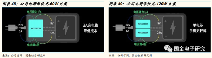 艾为针对手机大功率快充率先发布了单电芯4:1电荷泵方案。单颗芯片可以实现60W大功率充电,由于采用输入20V电压,充电线和连接器的电流仅3A。两颗芯片并联实现120W充电,可以采用单电芯电池,手机可以更轻薄。