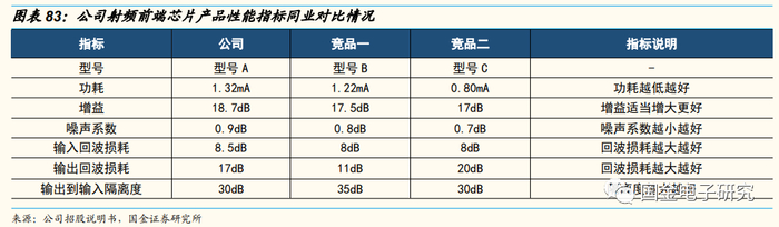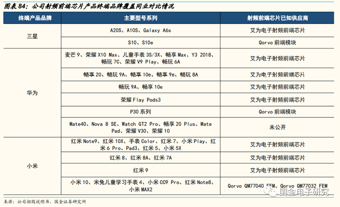 公司已覆盖的射频前端芯片产品部分主要指标能达到行业主流水平,部分指标存在优化空间,实现覆盖主流终端品牌部分机型。以公司射频前端芯片中出货量最多的GPS低噪声放大器为例,公司采用了OQ噪声优化技术,具备高增益和更优的回波损耗表现,其型号A产品在增益、输入输出回拨损耗方面具备相对竞争优势,在最低功耗和最优噪声系数等方面可满足大部分应用需求,但相比业界的最佳性能还有一定优化空间。公司音频功放芯片已实现覆盖主流终端品牌部分机型,包括三星A20S、A10S,华为畅享20、荣耀X10 Max等机型。