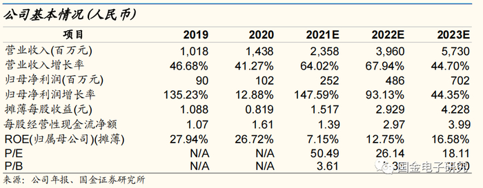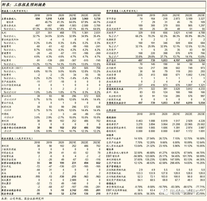 ◾ 预测公司2021-2023年EPS分别为1.52、2.93、4.23元,发行价(76.58元)对应PE分别为50.5、26.14、18.11倍。给予公司2022年90倍PE估值,“买入”评级,目标价263元。