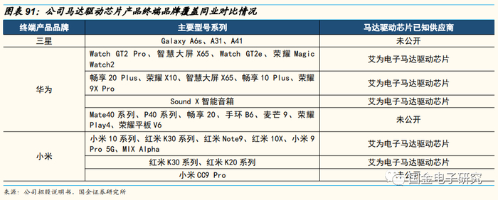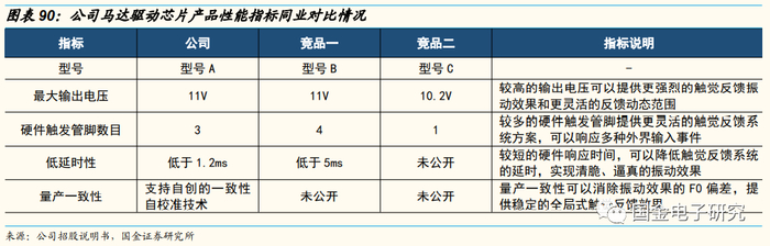 公司的马达驱动芯片产品主要指标能达到行业主流水平或优于同业竞品,实现覆盖主流终端品牌部分机型。以公司马达驱动芯片中出货量最多的线性马达驱动芯片为例,公司采用了一致性自校准、低延时驱动等核心技术,具备延时低、量产一致性好、最大输出电压高等性能优势,其型号A产品最大输出电压、硬件触发管脚数目达到行业主流水平,低延时性优于同业可比竞品,同时其一致性校准技术能够自动检测不同马达的F0,智能调整驱动波形,获得一致的振动效果,最终实现稳定的全局式触觉反馈效果。公司马达驱动芯片已实现覆盖主流终端品牌部分机型,包括华为畅享20 Plus、荣耀X10 PLUS、小米10系列等。