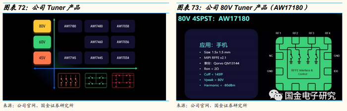 艾为的Tuner产品分别有高压和低压的4SPST、SP4T结构,大量应用于智能手机及智能手表等领域。AW17180是艾为的4SPST 80V高压Tuner,除了与美系竞品兼容之外,这款产品的Coff低于145fF,此外最大的特点是在35dBm连续波输入功率下,谐波输出小于-80dBm,达到业界优异水平。