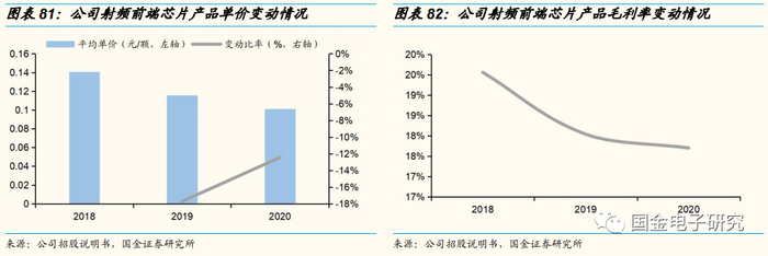 2020年射频前端芯片产品更新换代导致平均单价下降,市场需求结构变化引毛利率小幅下滑。公司于2020年持续进行射频前端芯片产品的更新换代,加大历史型号销售,导致该类产品平均单价有所下降。同时2020年由于毛利率水平较低的RF Switch收入占比上升且收入占比较高的GPS LNA毛利率有所下滑,导致射频前端芯片业务整体毛利率出现小幅下滑。