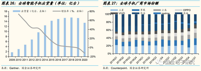 手机市场贡献85%以上营收,全球手机技术提升、国产手机品牌走强均为公司四大产品业绩提供支撑。公司主要产品出货增长的驱动力来自手机市场,2020年公司约85%营收来自手机市场,通常智能手机总共可能使用1-2颗音频功放芯片、10-15颗甚至更多的电源管理芯片、13-18颗射频前端产品(仅计算低噪放和开关两类)、1-5颗的马达驱动芯片。全球手机市场自2016年开始进入存量市场,2019年、2020年出现出货量负增长,而根据Gartner预测,5G手机换机潮的延迟到来将支持全球手机出货于2021年起逐步回升,同时国产品牌手机厂商全球出货量份额持续走高,2019年来份额占比已超40%,因此手机市场将为公司四大产品系列提供业绩稳定增长的基础。