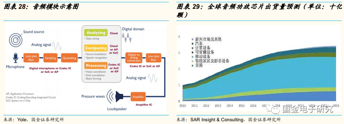 音频功放芯片是音频播放设备的核心部件,2019-2023年全球出货量CAGR约为3%。音频功放芯片主要应用于手机等多媒体播放设备的音频信号放大,其功能为放大来自音源或前级放大器输出的弱信号,并驱动播放设备发出声音,是多媒体播放设备的核心部件,可应用于智能手机、智能音箱及可穿戴设备等新智能硬件领域。根据SAR Insight & Consulting的市场统计,音频功放芯片2019年度的全球市场出货量超过30亿颗,主要下游应用市场包括手机、音响、车载、可穿戴设备、计算机设备、智能家居等领域,随着下游应用领域的需求扩张,全球音频功放芯片的市场规模还将持续扩大,2023年出货量预计将达到约34亿颗,2019-2023年CAGR约为3%。