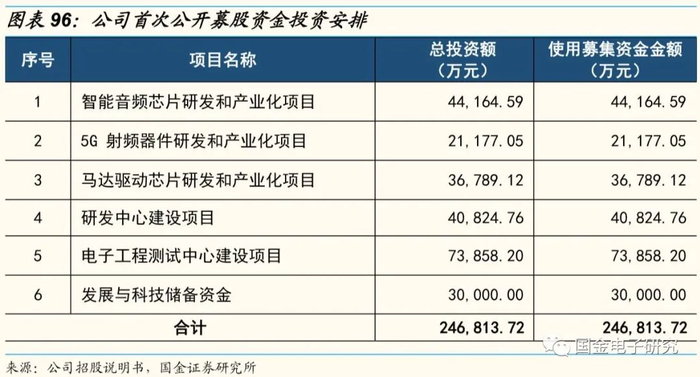 公司拟通过首次公开发行股票募集资金24.68亿元,以募集所得资金建设五大项目与补充储备资金。募投项目旨在对音频功放芯片、射频前端芯片、马达驱动芯片、电源管理芯片等现有产品线进行完善和升级,并积极开拓SAR传感器、触控芯片等产品领域,进一步提升公司产品竞争力,从而实现各项业务业绩的稳定增长;此外,研发中心建设项目和电子工程测试中心建设项目将以现有研发和技术积累为基础和依托,扩大研发、测试人员队伍,完善研发、测试所需的场地,配套相关研发、测试软、硬件设备,进一步提升企业的研发、测试水平,增强企业的可持续发展能力。