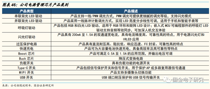 公司通过选择细分领域切入电源管理芯片市场,后不断拓展产品类别。公司于2011年开发呼吸灯驱动芯片、2015年开发闪光灯驱动芯片产品,通过细分领域成功切入电源管理芯片市场,至今为止其电源管理芯片产品主要包括LED驱动和电源管理两类,LED驱动芯片主要包括背光驱动、呼吸灯驱动、闪光灯驱动;电源管理芯片主要包括过压保护电路、低压降线性稳压器、BOOST芯片、BUCK芯片、快充芯片以及负载开关等产品,公司已覆盖的大部分产品的主要性能指标已达到行业主流或最高水平,充电产品线目前型号较单一,有待开发不同充电电流档位的产品以拓宽应用场景。