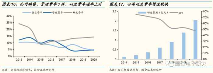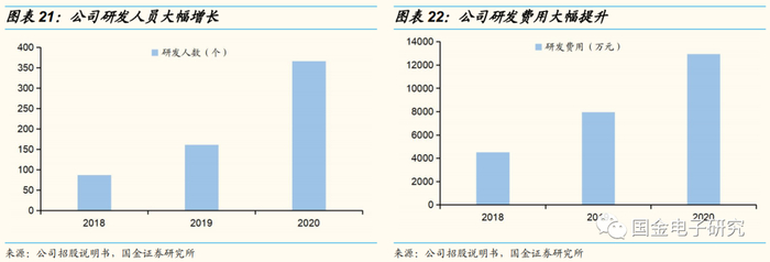 公司研发实力突出,技术成果显著。公司长期坚持数模混合信号、模拟和射频领域的研发和创新,围绕音频功放芯片、电源管理芯片、射频前端芯片、马达驱动芯片等产品市场积累了多项核心技术以及技术储备。公司拥有一支稳定的研发管理团队,公司董事长及技术带头人曾在华为技术研发部门工作多年,具有较强的技术研发能力,董事长孙洪军曾在华为担任工程师、技术副专家,副总郭辉曾在华为中央研发部担任IC设计工程师,董事程剑涛曾在华为中央研究部担任模拟电路设计工程师、项目经理、产品经理。公司非常重视技术研发,大量引进技术团队,公司2018年研发人数年平均为87人,2020年研发人员平均人数达到366人,大幅增加。截止到2020年12月31日,公司共有技术人员641人,占员工总数比例高达80.53%。公司研发费用也大幅增加,2018年研发费用为4519万元,2020年达到12943万元,大幅增加,2020年研发费用占营收比例达到9%,强大的研发团队和大量的研发投入为公司产品技术创新提供了强大的动力。