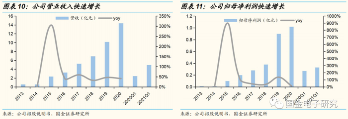 1)公司营收连续六年保持30%以上增速,2014-2020年CAGR达70.8%,2020年营收为14.38亿元,同比增长41.27%。公司营收连续多年高增长得益于公司产品品类不断扩增以及现有产品持续升级,产品受到终端客户广泛认可和采用,叠加智能手机的功能不断增多和芯片国产替代导致下游智能手机市场对芯片的需求快速增长,公司从中受益。