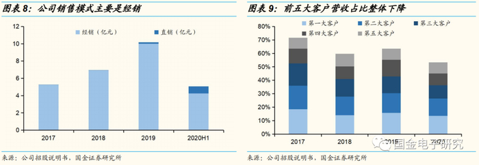 公司销售模式以经销为主、直销为辅,助力市场拓展。1)公司产品种类繁多,应用领域广泛,经销商可协助芯片设计公司有效拓展市场,使公司产品与终端客户产品快速结合,因此公司主要通过经销商销售产品。2020年前经销商收入占比均超98%,2020年降至84%,主要系当年第一大客户通过直销模式合作,营收占比达13.55%。2)公司前五大客户占比整体下降,2020年为53.4%,第一大客户占比13.55%,前五大客户收入占比较为接近。除2020年第一大客户为直销客户外,2016-2020年其余大客户均为经销商,公司产品终端客户较为分散。