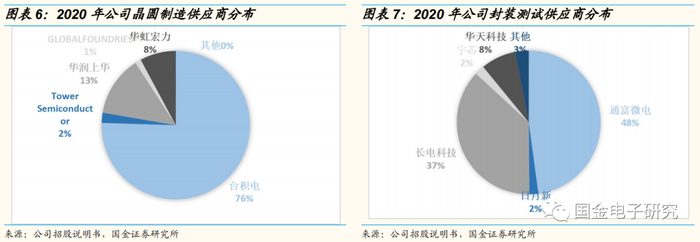 公司晶圆主要在台积电生产、封测主要在通富微电及长电科技。2020年,台积电是公司第一大供应商,采购金额5.23亿元,采购占比46.17%,第二大供应商分别是通富微电及长电科技,采购占比分别为18.71%及14.47%。在晶圆制造供应商方面,2020年,台积电占比高达75.5%,无锡华润上华占比13.15%,上海华虹宏力占比7.72%,三家公司合计占比96.36%,其他还有Tower Semiconductor及GLOBALFOUNDRIES等。在封装测试供应商方面,2020年,通富微电是第一大供应商,占比47.7%,长电科技次之,占比37.01%,华天科技占比7.88%,三家公司合计占比92.76%,其他还有宇芯及日月新等。
