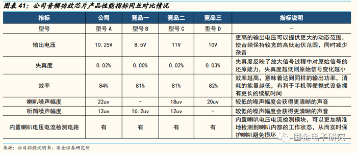 公司音频功放芯片全球市占率30%。2020年公司音频功放芯片的销售量约8.81亿颗,全球市占率达到30%。公司开发的音频功放芯片采用了射频噪声抑制、电磁干扰抑制、开环电荷泵等核心技术,具备高效率、声音清晰等性能优势。以公司开发的型号A音频功放芯片为例,在输出电压上和失真度方面该产品与竞品相当,使用效率优于同业竞品,内置喇叭电压电流检测模块,能更加精准地检测到喇叭内部的工作状态,听筒噪声幅度具备明显优势,喇叭噪声幅度不及同行业竞品,后续将持续演进升级。