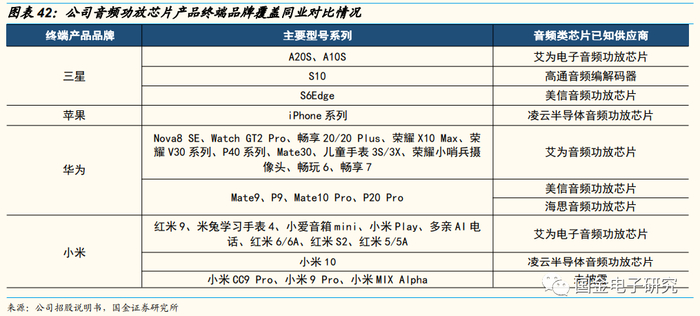 公司音频功放芯片已实现覆盖主流终端品牌部分机型,包括三星A20S、A10S,华为畅享20/20 Plus、荣耀X10 Max、红米9等机型。